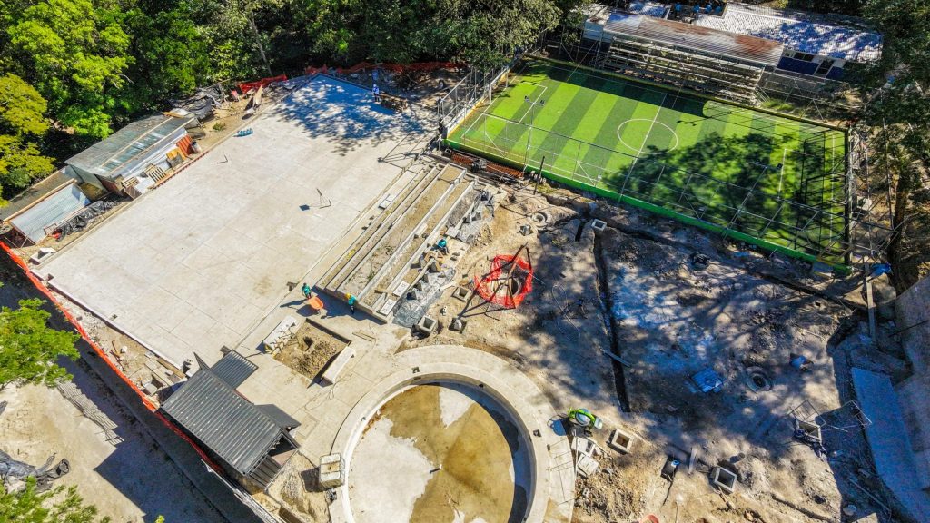 También se avanza en las excavaciones para el cableado eléctrico subterráneo y el sistema de drenaje, que permitirá canalizar aguas potables, grises y negras. En este mismo espacio se construye un área de juegos infantiles, al igual que en los trabajos de moldeo para la instalación de pedestales de faroles, el pabellón para el asta de banderas, las áreas de caminamiento y la fachada principal del polideportivo.