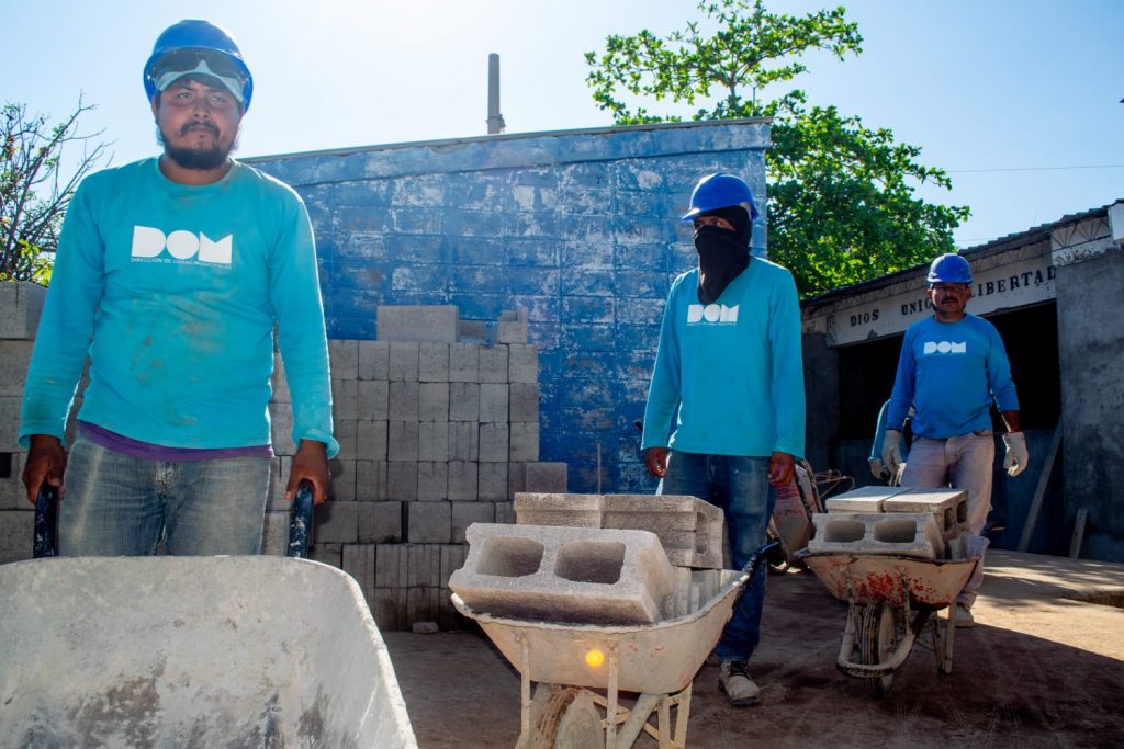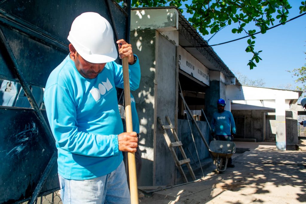 Este lunes, la cuadrilla de la Dirección de Obras Municipales trabajaban en la instalación de tuberías para drenaje de aguas lluvias, escarificación de paredes para su posterior repello en exteriores en aula número 5, moldeado para muro pretil del derramadero existente para aguas lluvias.