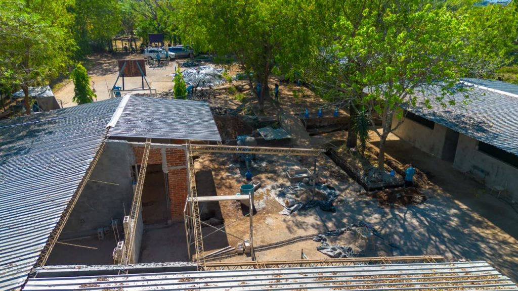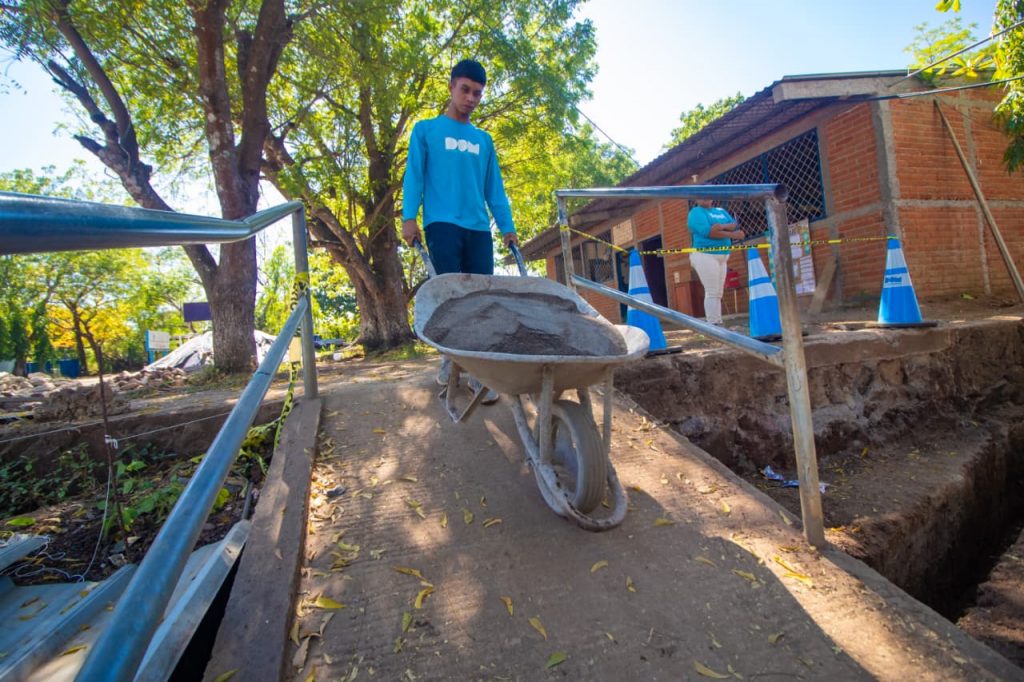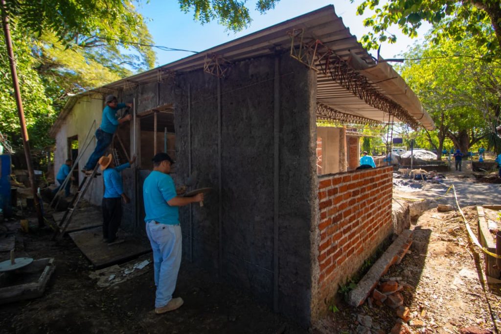 Este miércoles avanzaron en obras de repello y afinado en paredes de aulas, colocación de bloques, demoliciones del piso de concreto hidráulico de la cancha, excavaciones para la colocación de tuberías tanto eléctricas como drenajes de aguas lluvias.