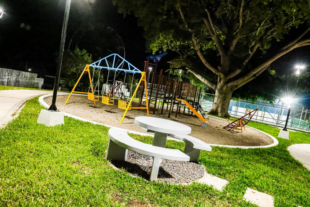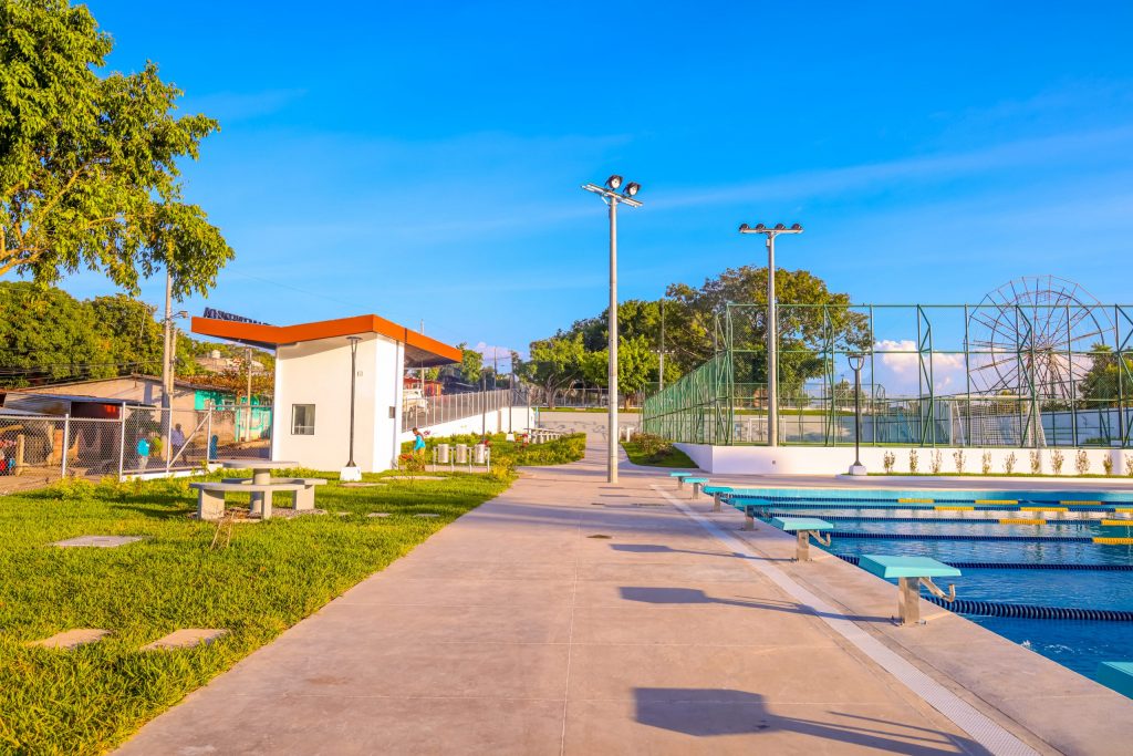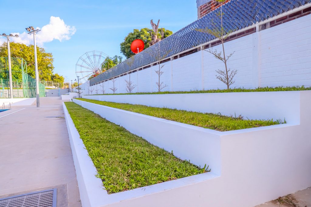 El contorno de la piscina y la cancha cuenta con aceras de concreto, zonas verdes, mesas y bancas circulares para la recreación, basureros y bebederos.