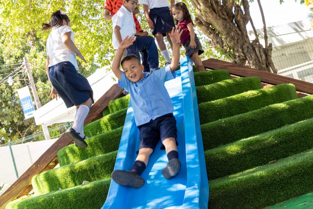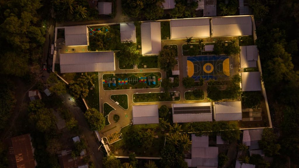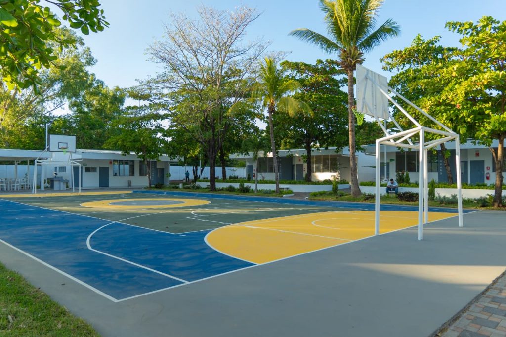 Tiene moderno sistema de drenaje, diferentes superficies de pisos, cubierta termoacústica para reducir el ruido y el calor, paneles solares para generar parte del consumo de energía, internet gratuito para reducir la brecha tecnológica y digital, iluminación LED, una infraestructura que cumple con la certificación EDGE, que acredita estándares de construcción sostenible y eficiencia energética.