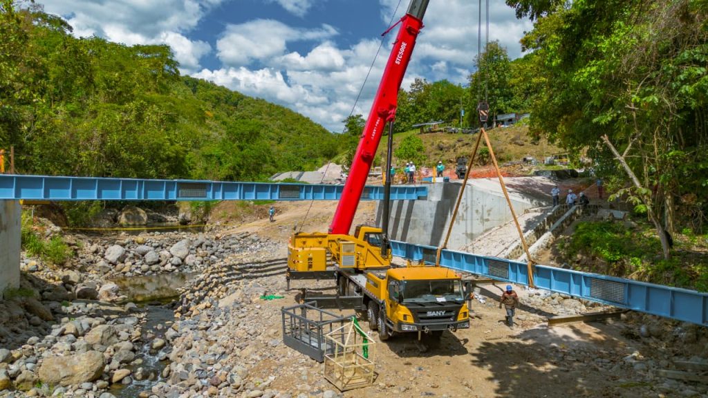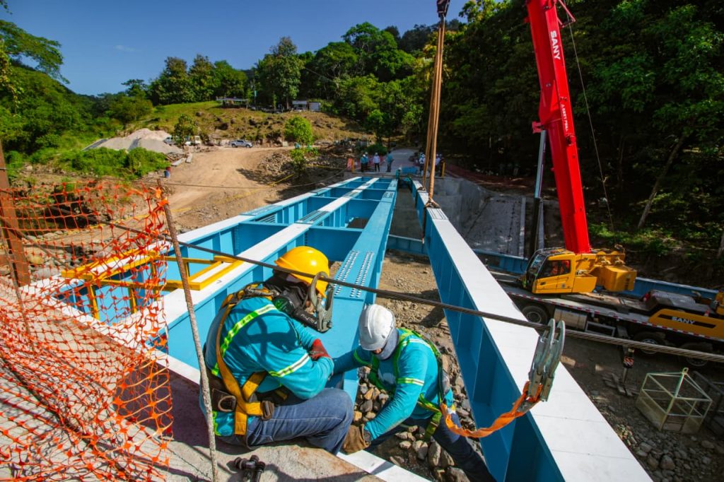 Esta obra está siendo construida sobre el río El Jute y tendrá 27 metros de longitud y un ancho de 8.10 metros. Ya fueron instalados 20 pilotes para fundaciones de 12 metros de profundidad, zapatas, aletones de 9 metros de altura, rellenos, compactación de los estribos y emplantillados de piedra de 400 metros cúbicos.